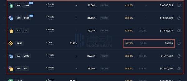 而就整體收益來看,目前Stablecoin收益最高的策略仍來自Fantom。不過需要注意的是紅框右側的TVL,一些策略由于TVL不高,因此能提供很高的APY,但隨著更多資金流入,TVL也就自然降下來了。