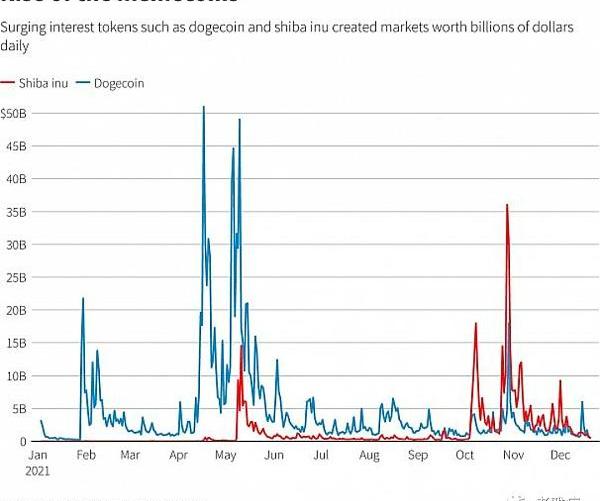 Dogecoin在2013年作為比特幣的衍生品推出,在5月飆升超過12,000%,達到歷史最高點,然后在12月中旬下滑了近80%。Shibainu與Dogecoin一樣是日本的犬類品種,它曾短暫地擠進了十大數字貨幣的行列。
