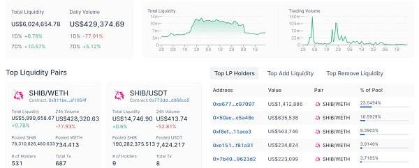 正如上圖所示,SHIB/WETH是SHIB最大的交易對,而排名第一的地址(0xa677...c87097)占據了SHIB/WETH對接近四分之一的流動性。