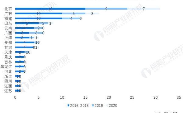 從招投標單位地區分布上來看,從2016年到2020年,參與區塊鏈項目招標的政府和科研機構覆蓋省份越來越多,2016-2019年共有10個省份的政府部門發布區塊鏈項目招標公告,2020年新增8個省份。從招標數量來看,北京和廣東的政府與科研機構較為活躍,招標總項目數位居前列。究其原因,兩地發展基礎好,高校和科研院所集中,且均是我國改革開放的先行軍、信息技術創新的排頭兵,相較于其他地區,政府對區塊鏈創新的需求更大。