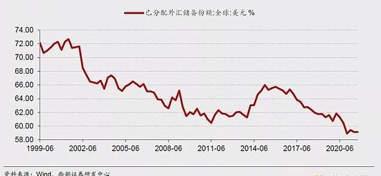 疫后美國財政刺激與全球高通脹并存,令美國與非美貨幣框架分化局面顯現化,美元體系仿佛“失靈”。疫后在美國財政刺激全面退出前各國已現通脹壓力。進而,在美聯儲尚未Taper的時候部分國家央行已經開始加息,美聯儲與非美央行貨幣政策框架分化局面顯現化。該局面又打破了此前美元體系的諸多規律。比如,美股跑贏非美權益階段通常對應美元升值周期,美股跑輸非美權益階段通常對應美元貶值周期。疫后則相反,去年3月以來美元指數(96.1564,?0.2552,?0.27%)中樞下移,但美股相對非美權益表現則更為強勁。此外,疫后全球已確認外儲中美元占比跌破60%,若美債規模進一步大幅攀升,美聯儲就將面臨放棄美債市場穩定性亦或者與非美央行政策完全脫鉤的抉擇。
