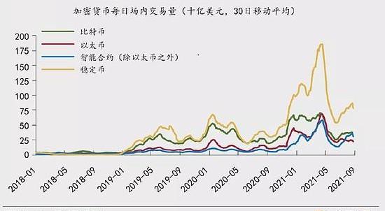 疫情以來,加密貨幣類資產市值快速走高。特別是2021年5月前,整體市值更是出現了2倍的漲幅,達到了2.5萬億美元。更重要的是,除了比特幣外,以太坊、穩定幣等其他加密貨幣資產均迎來高速發展。當然,5月后在各國監管政策的影響下,加密貨幣類資產出現調整,最大跌幅接近40%,這進一步體現出加密貨幣的真實屬性更接近投機性較強的資產而非貨幣。當然,結合前文可知疫后加密貨幣市值膨脹與其說是貨幣超發的結果,不如說是美元體系“失靈”背景下加速了去中心化金融體系的發展。