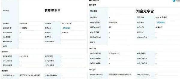 近日,天眼查顯示,阿里巴巴新加坡控股有限公司申請注冊“阿里元宇宙”“淘寶元宇宙”“釘釘元宇宙”等商標,國際分類涉及科學儀器、廣告銷售、教育娛樂等,目前商標狀態為注冊申請中。