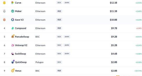 DeFi項目鎖定資產前十排名及鎖倉量,數據來源:Debank