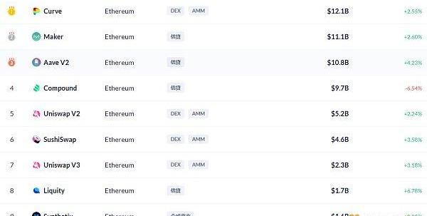 Ethereum鏈上DeFi鎖定資產前十排名及鎖倉量,數據來源:Debank