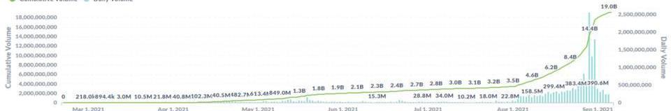 dYdX:近期日均交易額為7億美元,8月30日當天,受到首期交易挖礦即將結束、dYdX代幣將在10天內上線的預期影響,10億/20億美元,官網顯示為13億美元。