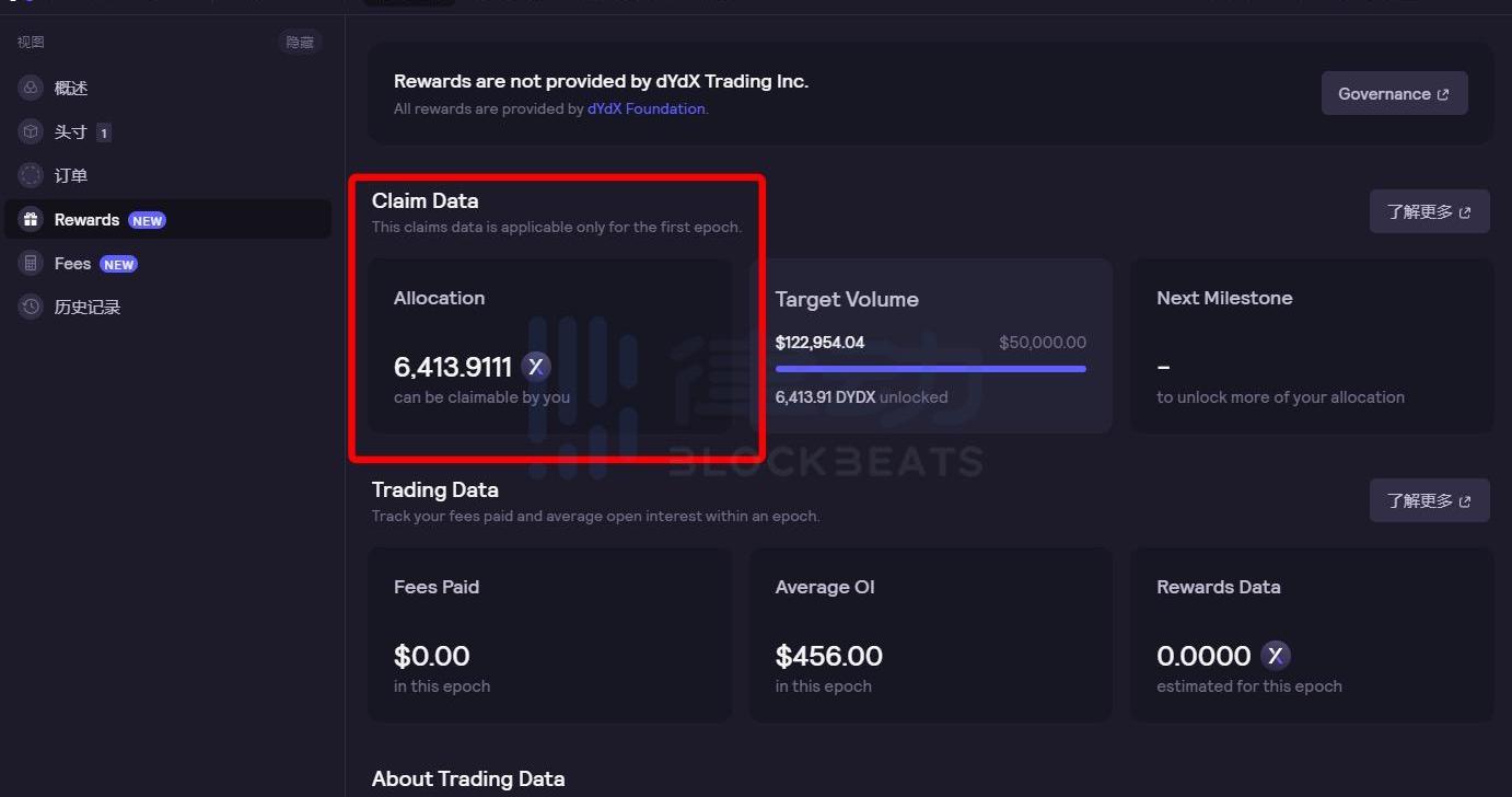 進入Rewards后,將顯示該地址是否有DYDX空投可以領取。