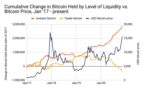比特幣的價格正在上漲,因為在可購買的比特幣數量相對較少的時候,對比特幣的需求卻正在增加。雖然隨著開采量的增加,比特幣的總供應量每天都在增長,但實際可購買的數量取決于持有人是否愿意出售或交易。根據Chainalysis分析,我們通過跟蹤錢包中持有的比特幣數量來量化此數量,如果這些錢包發送的比特幣少于他們曾經收到的25%,我們將其稱為非流動性或投資者持有的比特幣,相反錢包中持有的比特幣少于發送的比特幣數量,那就是我們所說的流動性或交易商持有的比特幣。