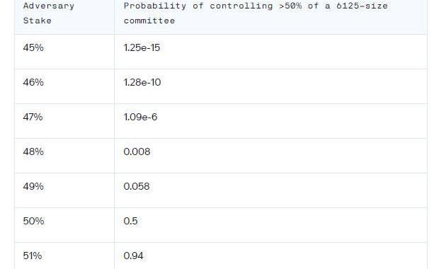 更正式地說,擁有p%股權的惡意行為者控制N個驗證人規模的委員會中超過50%的概率遵循二項分布。