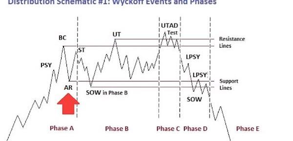 如果你看一下比特幣在日線圖上的表現,你可以清楚地看到所有的威科夫分配模式點都出現了。
