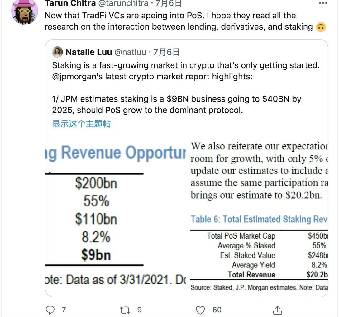 近期有兩則消息是大家需要關注的,一個是摩根大通發布的Staking報告,另一個是有銀行已開始在提供Staking服務。