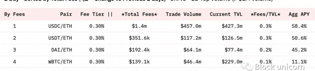 第一步已經完成,其他貨幣對也在跟進。在USDC/ETHTVL躍升后不久,USDT/ETH的TVL以0.05%的速度翻了一番,而WBTC/ETH~300倍!DAI/ETH是交易量第三大的ETH對,但0.05%TVL尚未起飛......