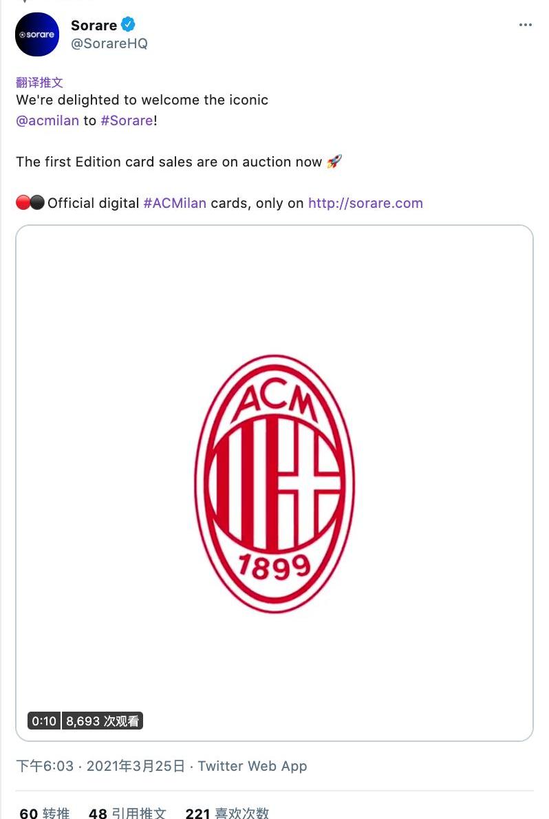 AC米蘭足球俱樂部與Sorare達成合作,將發售球星卡NFT
