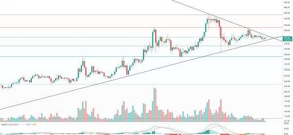 延續三角末端震蕩,等待后續變盤,趨勢支撐450美金,不破中長線可以持有。