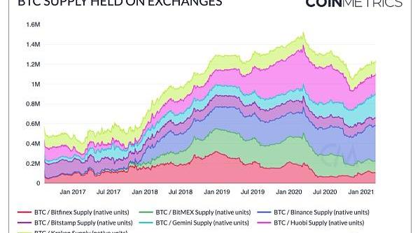 2021年,交易所持有的BTC數量繼續攀升。交易所持有的BTC在2020年初達到歷史高點后,在2020年3月崩盤后下降,并在這一年的大部分時間里呈下降趨勢。但在2020年11月,趨勢發生了逆轉,主要得益于Binance和Gemini持有的供應量增加。這種潛在的信號是大量散戶交易者將比特幣放在交易所中,而不是在自己的錢包中。