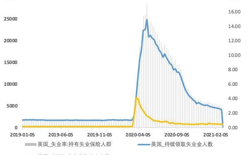 美國1.9萬億美元的財政刺激政策有望加強改善經濟預期,帶來美國更大規模的國債發行,美債供給壓力的上行將主要反應在利率的上行之上。另外,財政的過度刺激對商品供需兩端的不平衡加劇,將拉動美國核心商品通脹上行。從商品需求端來看,財政補貼將導致個人和公司的收入增加,從而推動商品消費;然而,在商品的供給端,過度的失業補貼將擠出低薪就業崗位,從而使工業生產恢復緩慢。對商品的需求明顯大于供給,無疑將拉動美國核心商品的通脹上行。