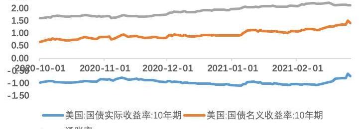 2020年4月至8月上旬,10Y美債的收益率維持在0.5-0.7%的低水位平穩運行,從8月中旬到1月底,美債收益率開啟上行趨勢。從1月底至今,美國的通脹率保持穩定的趨勢,因此,美債收益率的上漲主要是由實際收益率導致的。如今,美債收益率已超過1.5%,引起金融市場對通脹的擔憂。