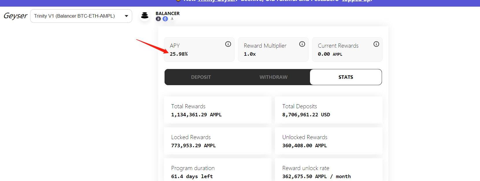 當時的做市收益很高,年化收益都在100%以上。因為收益高,會有更多人買入AMPL參加做市,做市的收益會繼續投入做市。這給了不斷通脹的AMPL一個很好的去處。然而隨著收益降低,做市的積極性會減弱,而得到的獎勵代幣也會拋向市場,造成價格進一步下跌。即便是“間歇泉”,參與的資產也很有少,局限在BTC、ETH。此外,AMPL沒有更具規模的用例,也沒有更廣范圍的流通。