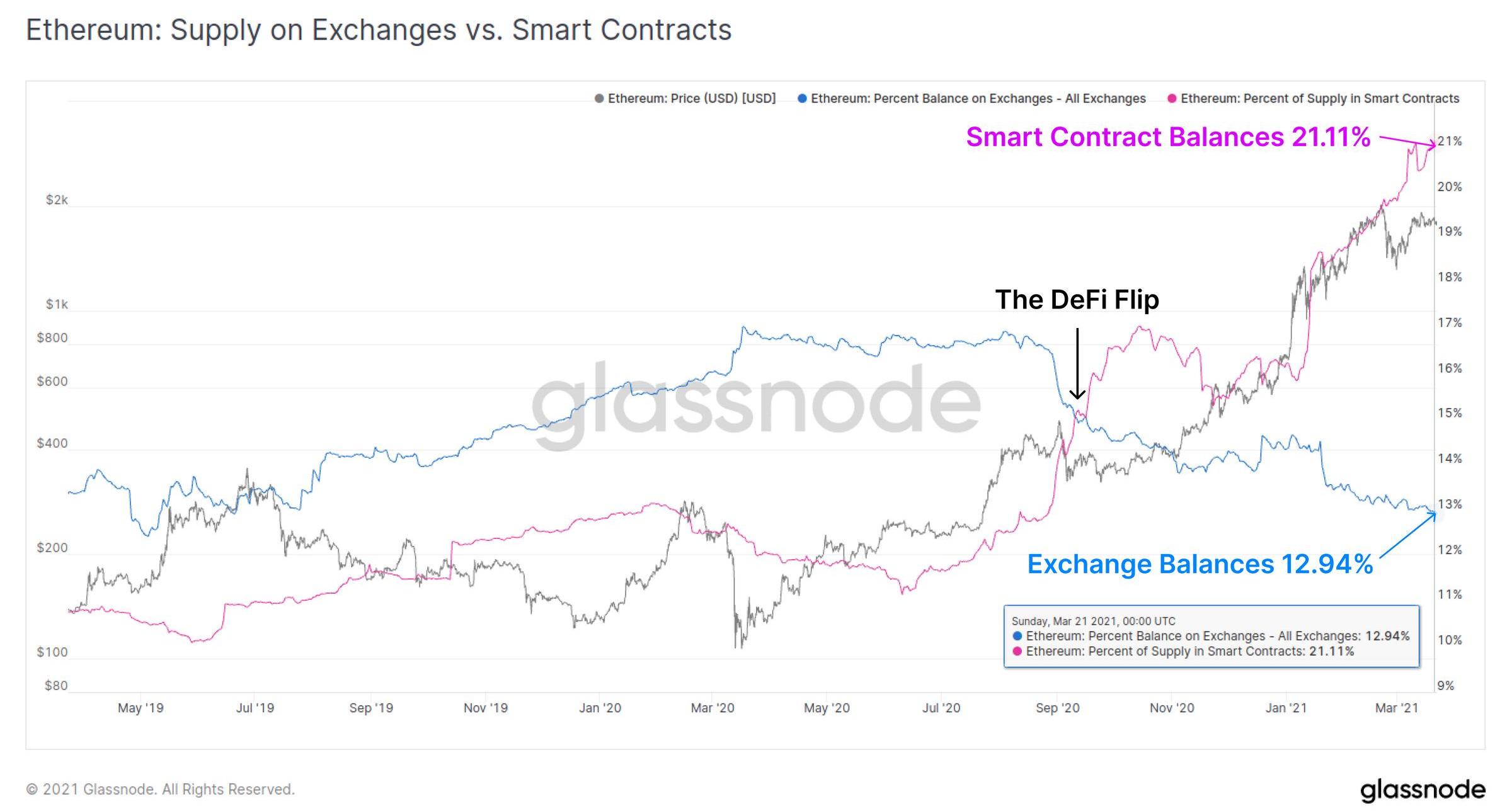 與此同時,智能合約保管的ETH余額在2020年9月份正式超過了中心化交易所的余額。截至今日,交易所持有的ETH占到了總量的12.94%,而智能合約目前保管的ETH占到了總量的5分1以上,這表明產品市場符合2020年開始的趨勢,自那時起,火熱的DeFi便鎖定了大量ETH供應。