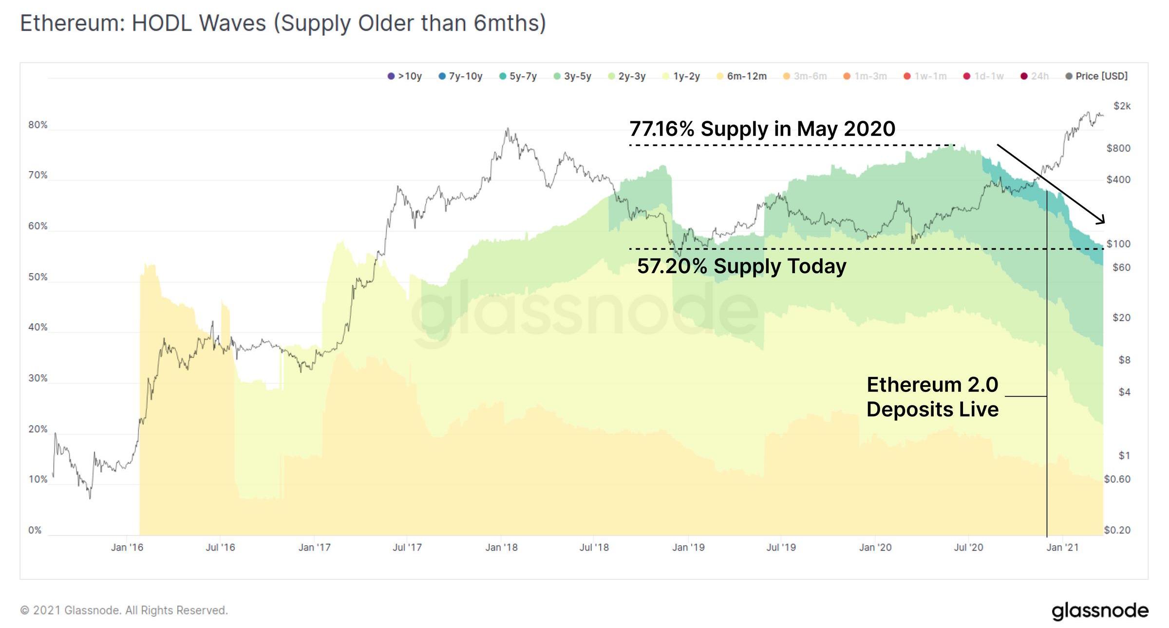 我們也看到更多長期休眠的ETH開始逐漸蘇醒,下圖顯示,自2020年5月以來,持有時間在6個月以上的ETH供應量一直在穩步下降。除了一些獲利回吐之外,一些供應可能已經被部署到DeFi智能合約,甚至是以太坊2.0staking合約。