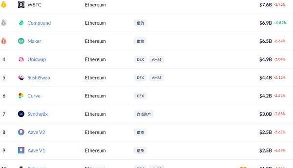 DeFi項目鎖定資產前十排名及鎖倉量,數據來源:Debank