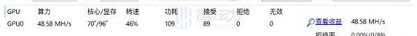 RX5700XT是AMD于2019年7月推出基于RDNA1架構的顯卡,其默認挖以太坊算力為54MH/s,功耗為180W。本次測試通過限制功耗的方式,日均算力約為46MH/s,功耗為110W。