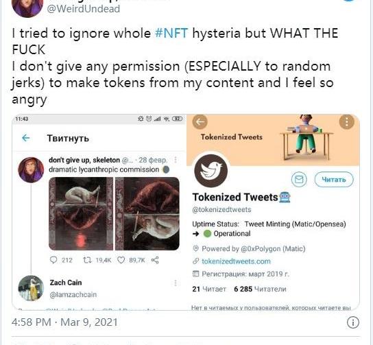 上周,WeirdUndead向OpenSea提交了一系列法律通知,她的粉絲也向OpenSea提交了法律通知,需要該平臺能夠阻止相關NFT交易,用WeirdUndead的話說,這是一次“瘋狂而毫無意義的版權侵權”。據悉,WeirdUndead的模仿者一直使用“TokenizedTweets”ID在出售其作品。