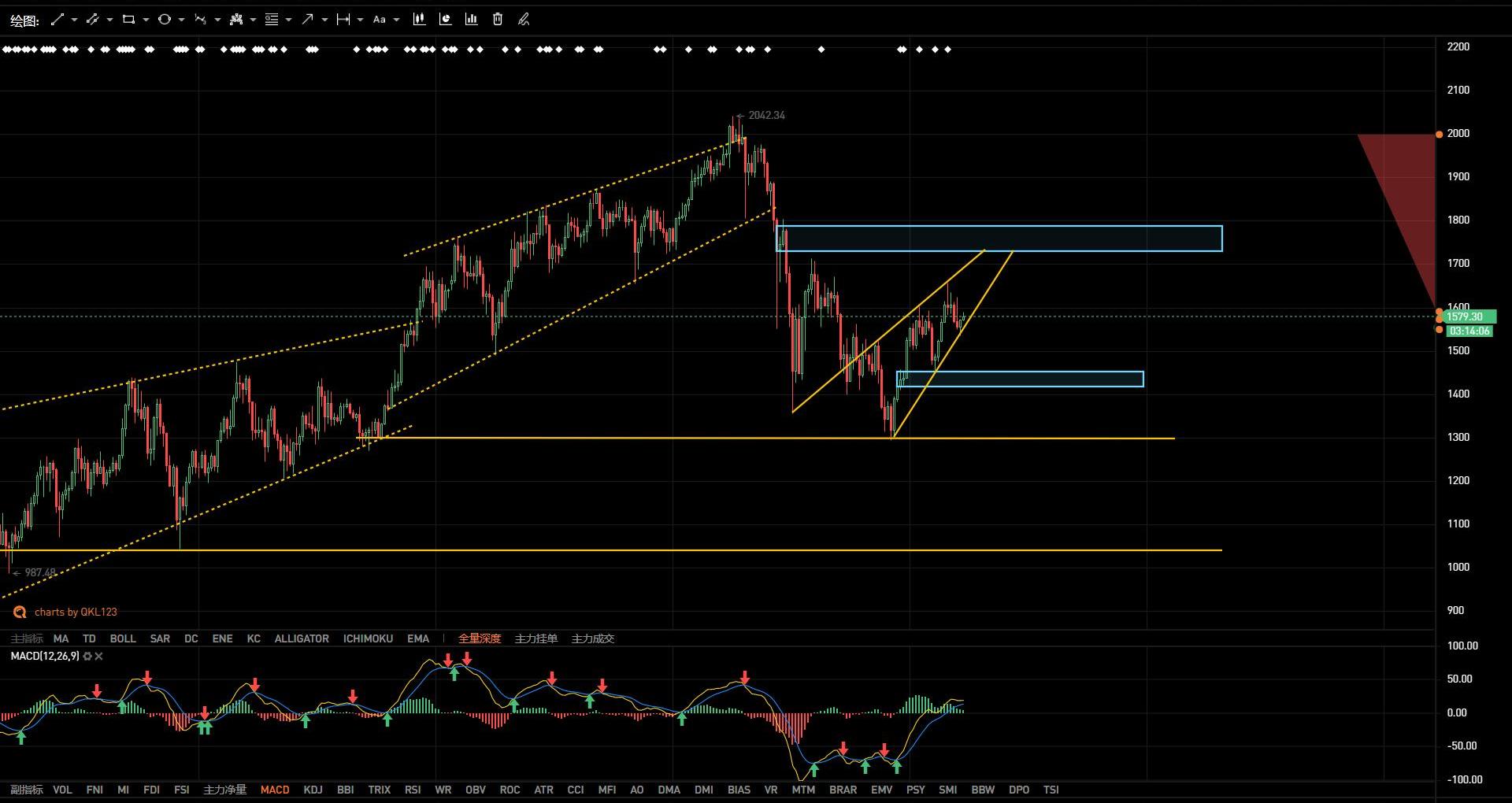 今日火幣科技發布公告,稱有關香港證監會已向公司全資附屬公司火幣資產管理授出牌照,以進行火幣資產管理投資于虛擬資產的投資組合,受此新聞影響,HT在大盤回調的情況下逆勢上漲16%。技術面上,火幣交易所平臺幣HT經歷短期楔形結構整理,成功向上突破上軌但在前高附近受阻,當前形成孕線結構,若向上假突破則在17.8附近構成有效壓力,向下關注短期需求區14.85-15.35,該位置可能構成一定下跌阻力,下方重點關注有效支撐區11.95-12.55。