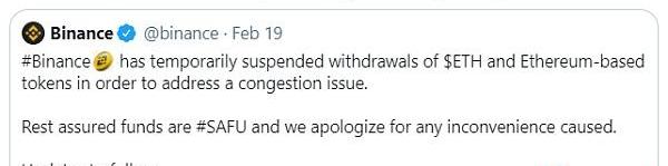 2月19日晚上8點51分,中心化交易所幣安在推特發布消息稱:”由于網絡擁堵問題,幣安交易所平臺暫時停止ETH以及基于以太坊的代幣的提現業務。“一小時后,幣安恢復了該提現功能。