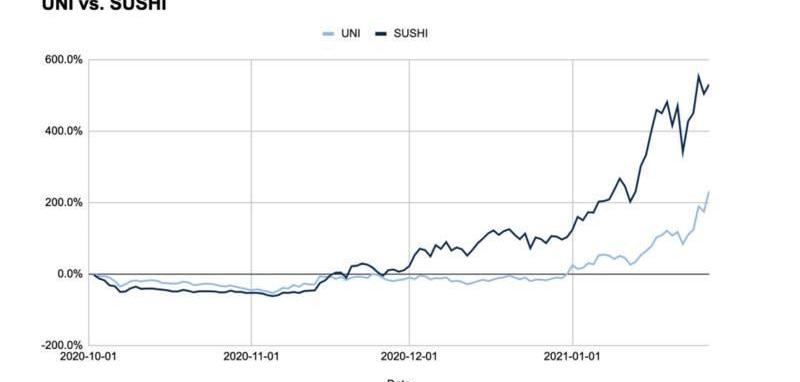今天來看,自2020年第四季度開始,Uniswap的漲幅已經飆升到232%,而Sushiswap則在大家都以為它死了之后,以530%的漲幅重新爆發。?