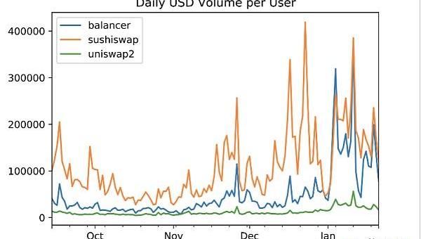 Sushiswap和Uniswap擁有了相近的交易量,但在用戶數量方面遠遠落后,這意味著Sushiswap和Uniswap的用戶側寫情況很不一樣。每日用戶的日交易量數據顯示Sushiswap用戶每人每天交易超過10萬美元。而Uniswap用戶每人每天交易量低于1萬美元。?