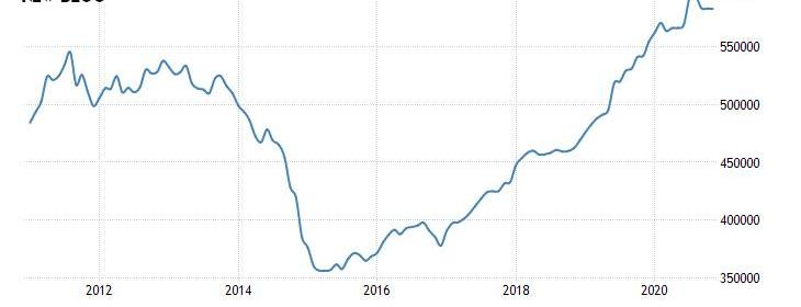在2019-2020年期間,隨著黃金價格大幅上漲,俄羅斯的外匯儲備也隨之上升,如下圖所示: