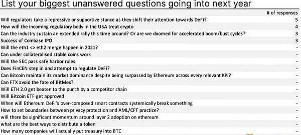 展現出最強信心的問題:在眾多問題中,受訪者對穩定幣供應增長最有信心,他們相信增長速度同比增長330%,2021年美國將會通過一只BTCETF。