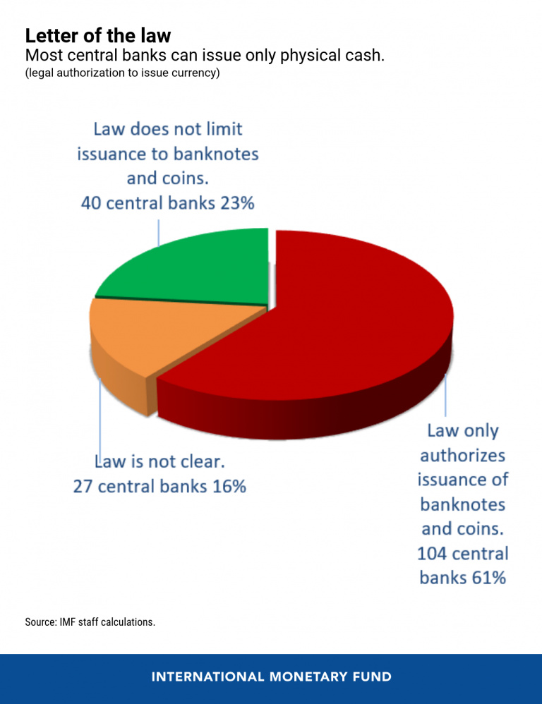 為了幫助各國做出這一評估,我們在一份新的 IMF staff 報告中審查了 174 個 IMF 成員國的央行法律,結果發現只有大約 40 個(約占 23%)成員國在法律上獲準發行數字貨幣。