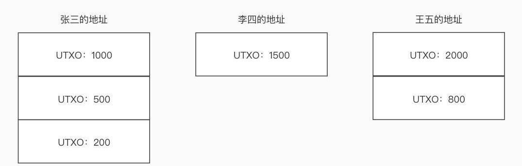 三筆轉賬結束后,三個人地址下的UTXO會變成這樣:張三有一筆1000元的UTXO,一筆500元的UTXO和一筆200元的UTXO;李四有一筆1500元的UTXO;王五有一筆2000元的UTXO和一筆800元的UTXO。