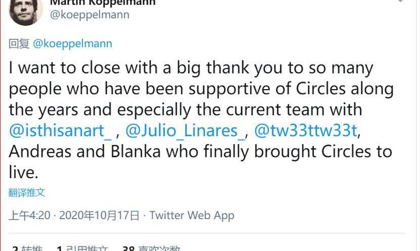 僅在文末感謝很多人多年來對Circles的大力支持,尤其是目前團隊中的@isthisanart_、@Julio_Linares_、@tw33ttw33t、Andreas和Blanka,使他們最終促成了Circles的誕生。