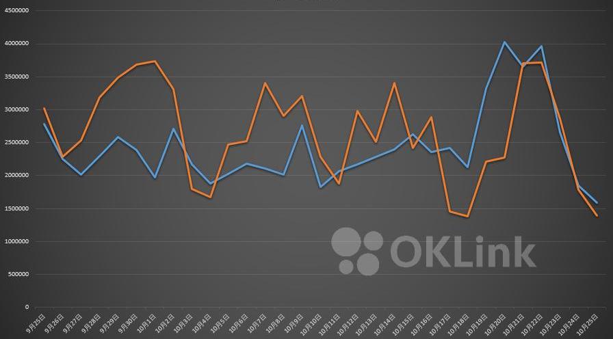 而以太坊則處于聯動比特幣的狀態,鏈上交易量同樣在一波高峰。單日鏈上交易量達到370萬ETH的近期高位。不過相比于九月初的DeFi狂熱,這一數字依舊有不小的差距。