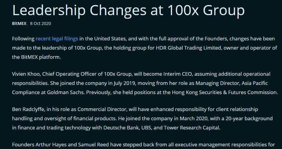 在BitMEX遭到美國司法部和商品期貨交易委員會提起訴訟后,BitMEX平臺的所有者和運營商「100xGroup」發布公告進行了管理層人事變動。