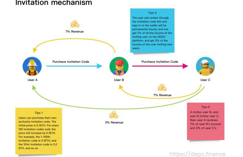 用戶通過輸入推薦鏈接登錄到錢包,并永久綁定以太坊地址后將獲得受邀者收入的7%以及其他新邀請用戶的3%收入,例如如果用戶A邀請了用戶B,而B邀請了C,那么用戶A將獲得用戶B的7%的收入和用戶C的3%的收入。