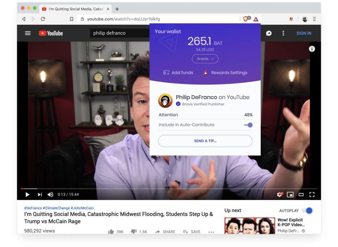 Brave已被開發用于使用一種名為BasicAttentionToken的加密貨幣。例如,當我使用Brave來觀看YouTube時,我可以單擊BAT圖標來訪問錢包。