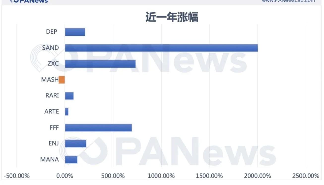 MANA和ENJ算是NFT中的兩大龍頭項目,其中MANA曾是區塊鏈游戲類第一大流通市值項目,被認為是VR版“頭號玩家”,近一年漲幅達132.02%;ENJ是最大的在線游戲社區創作平臺,近一年漲幅約為223.5%。