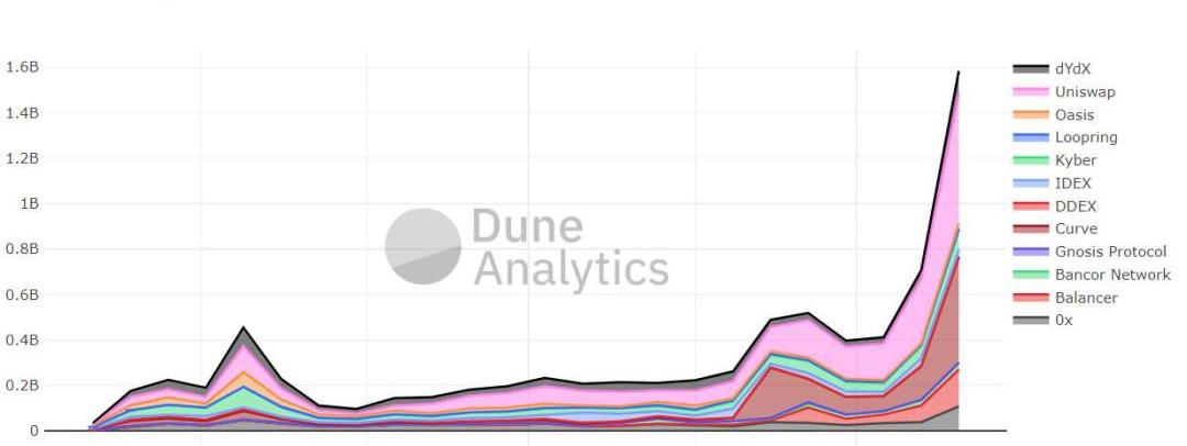 以其中的DEX賽道為例,7月份總交易額已經達到了42億美元,而去年DEX總交易額僅為24億美元。其中的明星項目Uniswap和CurveFinance更是堪稱瘋狂,日交易量在7月突破1億美元大關,CurveFinance的日交易量更是一度突破1.5億美元,睥睨一眾二三線中心化交易平臺。