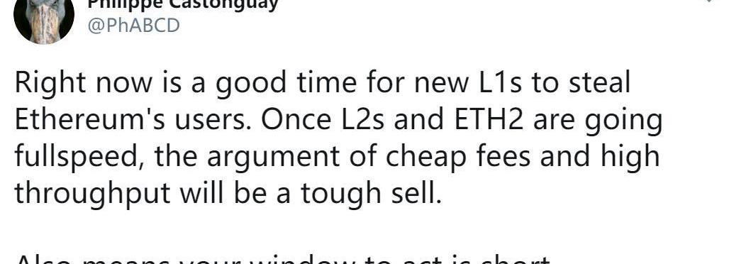 以太坊研發人員PhilippeCastonguay在7月28日就公開直言:現在是新的Layer-1竊取以太坊用戶的最好時機。否則一旦接下來Layer-2和ETH2.0全速前進,廉價費用和高吞吐量的優勢會讓,給Layer-1所留的最后行動窗口,很短。