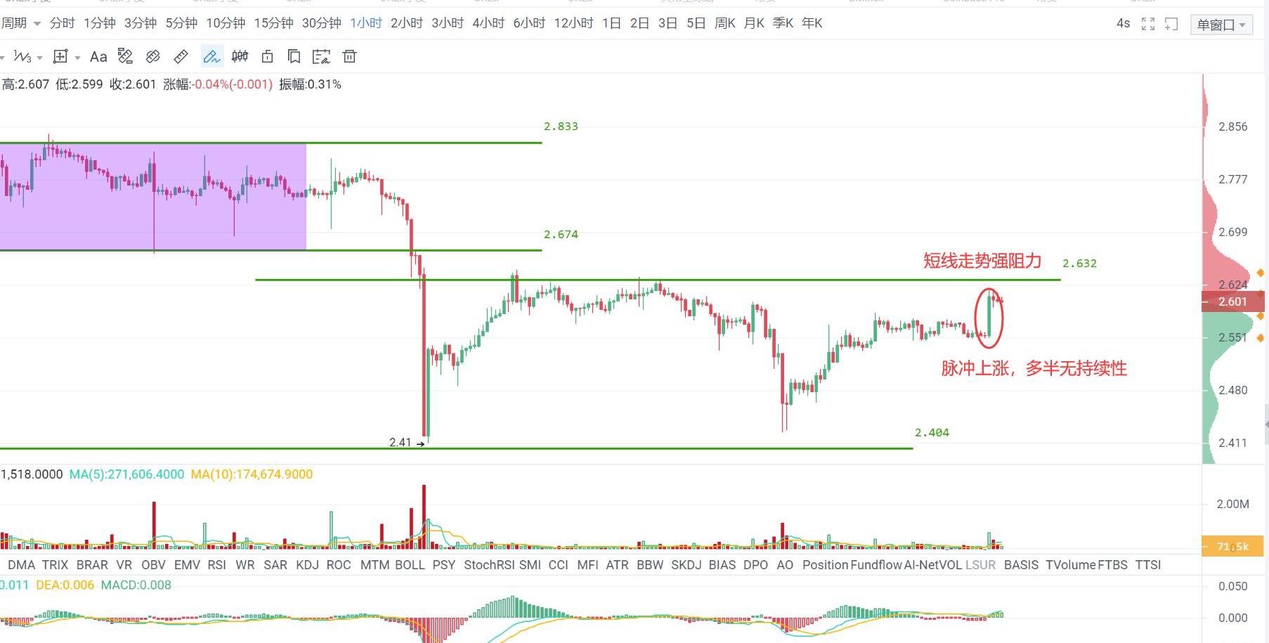 目前幣價已經來到了近日關鍵阻力2.63附近,看似價格馬上就要突破此價位,但縱觀歷史你會發現10次同類型的走勢有一多半最終都沒有上破成功,所以從概率上講現在去做多單博弈風險收益比不合適。