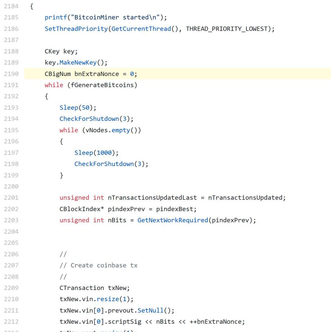早在v0.1版本時,在main.cpp里有一個創建PoW共識機制的特定函數。當然以目前的水平找到該函數是非常容易的,但它仍然需要大量的CPU能力才能找到。我們可以在下圖中看到創建此次Coinbase交易的代碼。
