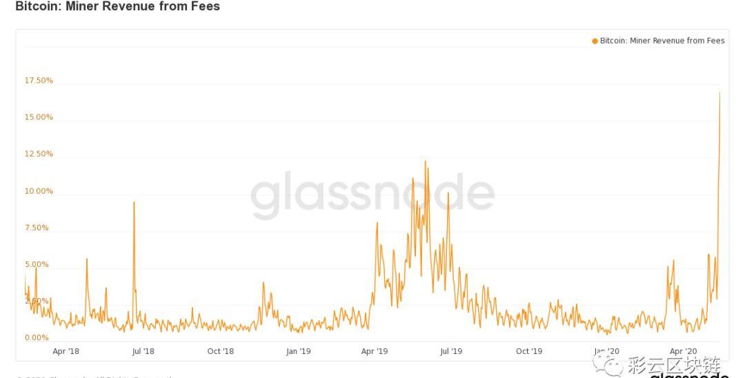 到目前為止發生的事情可以稱為微型死亡螺旋情景。礦工唯一能得到的好處是網絡擁擠導致交易費用的急劇增加,從4月底的0.62美元增加到5月15日的5.21美元。目前,由于這種動態變化,交易費用占了礦工收入的17%。占礦工收入的百分比。這是自2018年1月以來的最高比例。目前一個區塊的手續費約為1~2BTC,加上6.25的區塊獎勵,礦工總共獲得的收入約為7到8個比特幣,這減輕了一些減半帶來的損失。