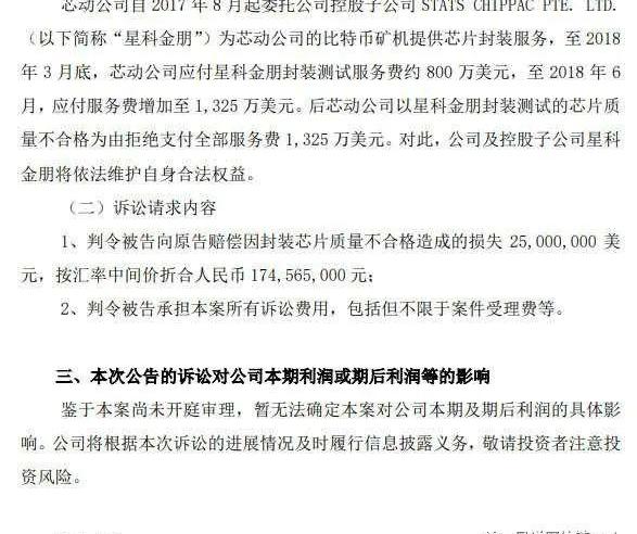 XRP/HKD+1.01%吳說區塊鏈獲悉,礦機公司芯動科技向A股上市公司、中國芯片封裝龍頭企業長電科技發起訴訟,索賠2500萬美金,折合人民幣約1.74億人民幣。