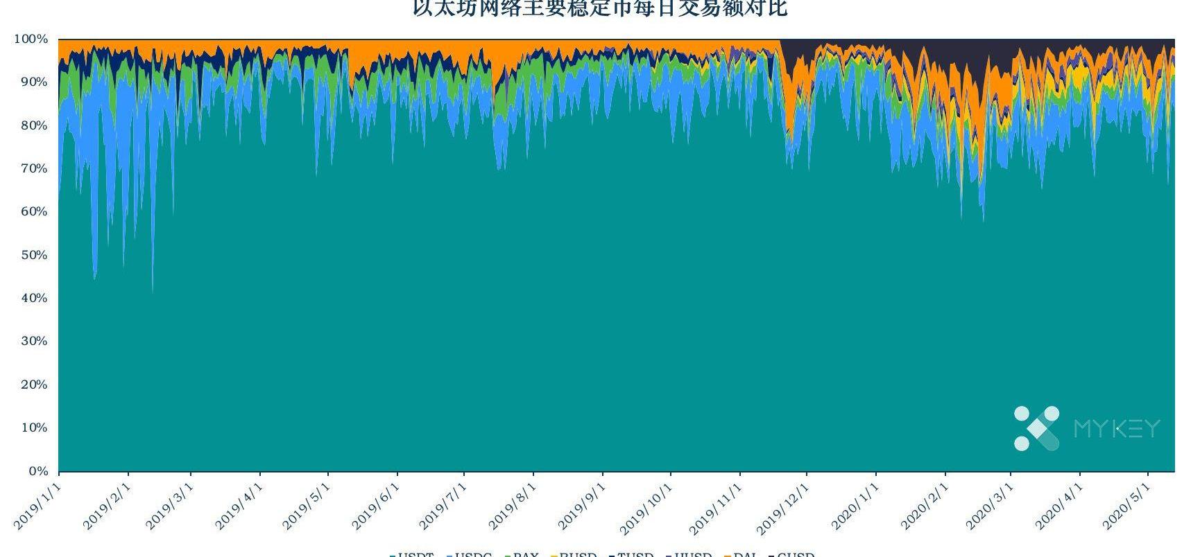 在這個過程中,穩定幣的多樣性也在提升。一方面,不同的團隊開始提供穩定幣的服務,我們看到USDC、PAX、DAI、GUSD等都開始占據一定的份額;另一方面,占據鰲頭的USDT也開始在更多的鏈上發行;還有就是,穩定幣的使用場景也大大增加,不再限于法幣OTC出入金和幣幣交易。