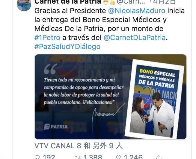 根據委內瑞拉政府官方發布的推文表示,這個名為“祖國醫生”的計劃,將使用委內瑞拉政府的“Patria系統”完成,該平臺的目的是繞過該國正在崩潰的銀行系統,并使用加密貨幣發行獎金和補貼。