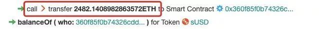 在完成對sUSD/WETH的拉升后,攻擊者此時需要采集大量的sUSD,為后續兌換WETH做準備。為了達成這個目的,攻擊者向Synthetix發起sUSD的購買,通過向Synthetix發送6000ETH購買sUSD,直接把Synthetix中的sUSD買空,Synthetix合約返還2482個ETH給攻擊者。